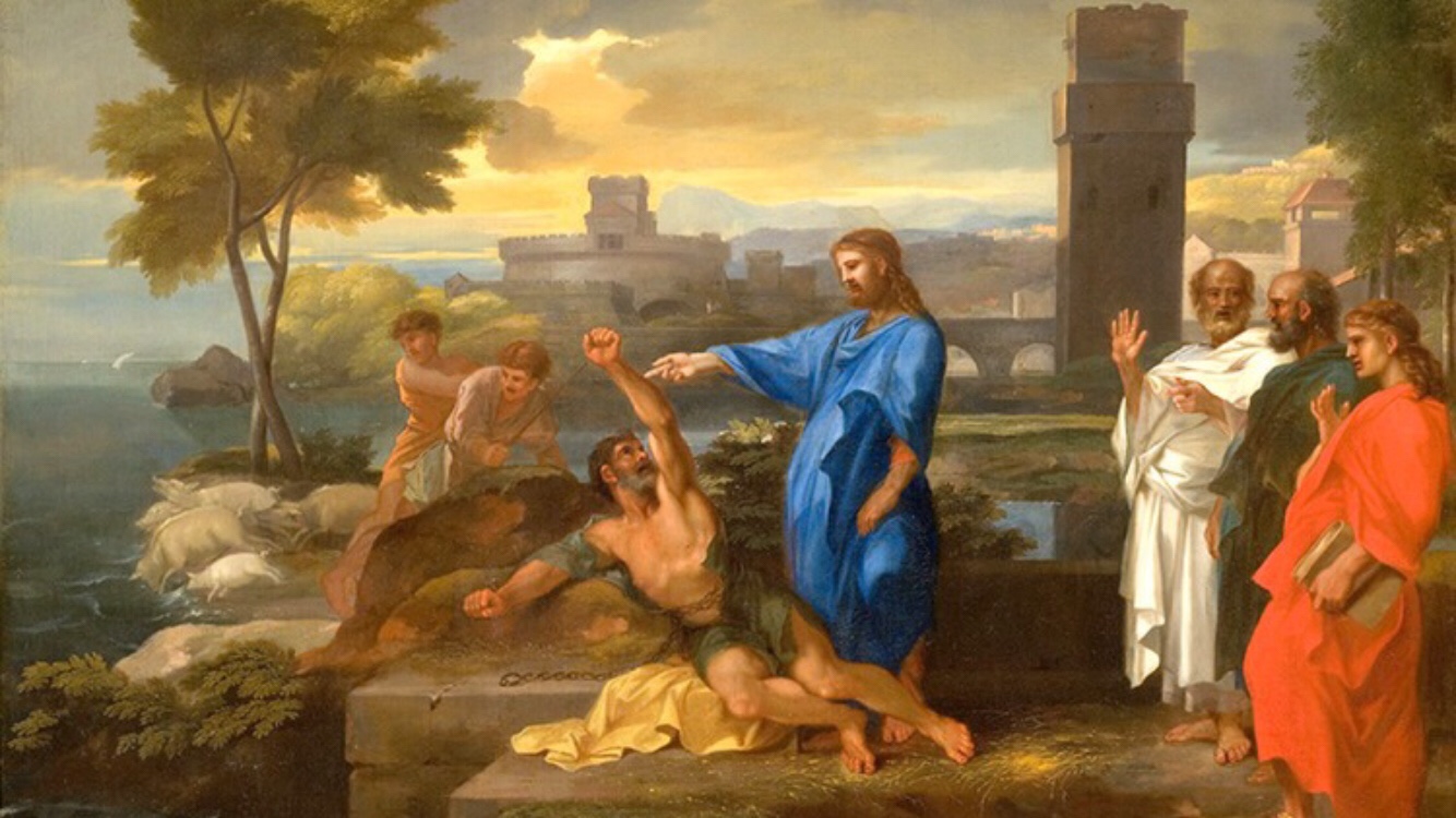 Dalam Lukas 8: 26-39 diceritakan bahwa ada seseorang yang kerasukan banyak setan. Dengan adanya setan-setan yang menguasai tubuhnya, orang itu menjadi sangat kuat dan bisa mengobrak abrik apa saja, termasuk rantai-rantai yang dipasang orang lain untuk mengekangnya. Semua orang yang disekelilingnya tentu saja takut, tetapi tidak ada seorang pun yang bisa mengatasi keberingasan orang itu.
